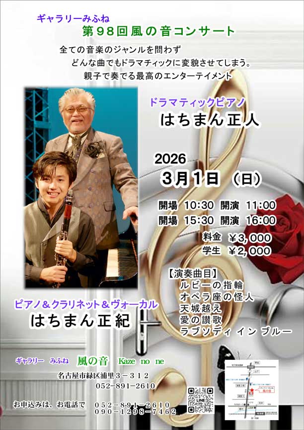 - 2026年3月コンサートお席は予約制です。 お電話でご連絡をお願いします。